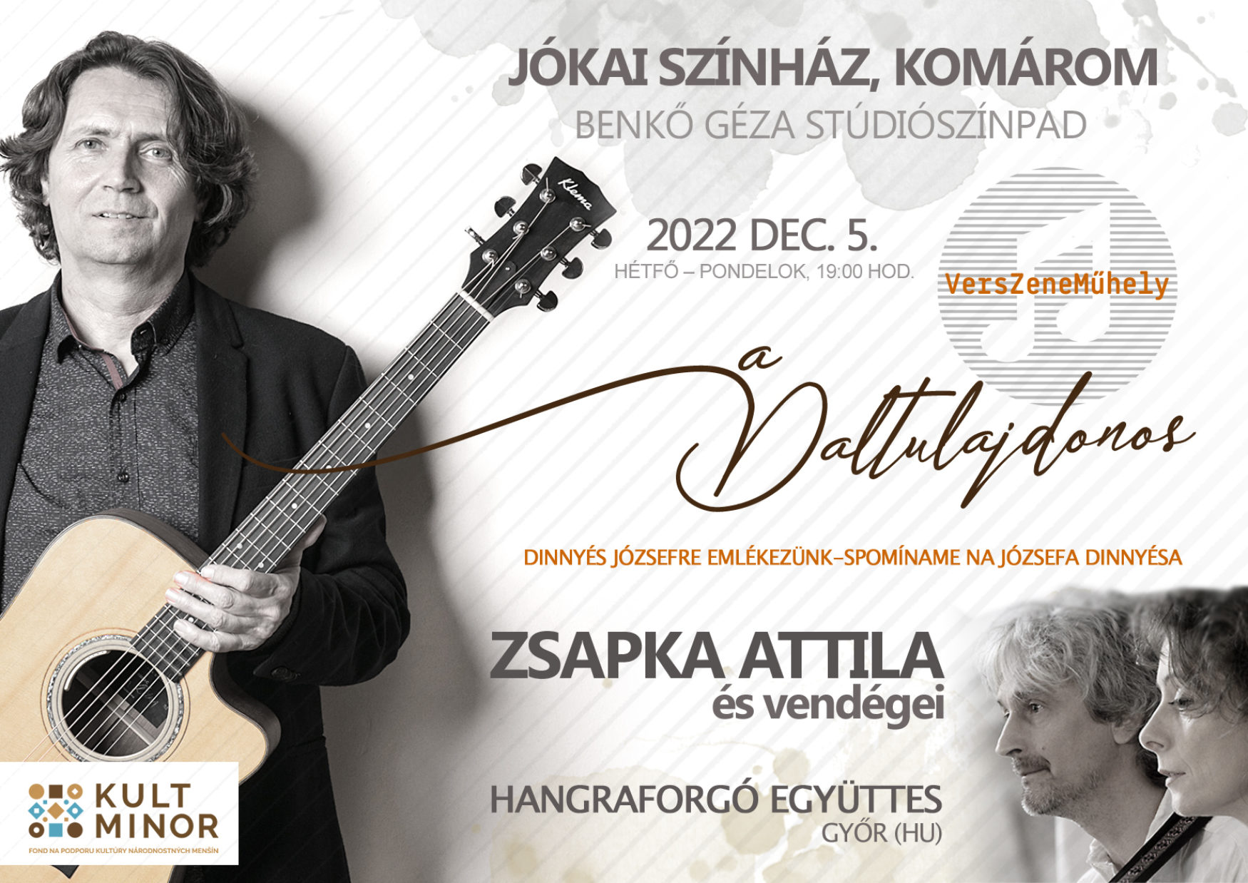 Dinnyés József daltulajdonos, a magyarországi pol - beat egyik legjelesebb alakja és egyben úttörője. Munkásságából fakadó hagyatéka mérhetetlenül gazdag, közel 2000 dalból áll. Írt saját dalszövegeket, verseket és zsoltárokat zenésített meg. Alkotásainak közös jellemzője a mély mondanivalóval bíró tiszta őszinteség, az emberségbe vetett hit és a nemzethez való őszinte ragaszkodás. Nem csupán rajongójának, de tanítványának is tekinthetem magam. Neki köszönhetem többek között az olyan pályatársakkal való megismerkedést, mint Kátai Zoltán énekmondó, a Credo együttes, Márk Attila verséneklő vagy a Hangraforgó együttes. Utóbbi formáció lesz a december 5 - i klubest vendége, akik saját vers megzenésítéseik mellett számos dalt játszanak majd néhai közös barátunktól, példaképünktől, mentorunktól.
