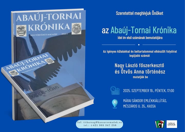 Szeretettel meghívjuk Önöket az Abaúj-Tornai Krónika idei év első számának bemutatójára a Márai Sándor Emlékkiállításba 2025. szeptember 19-én, pénteken, 17.00 órai kezdettel.